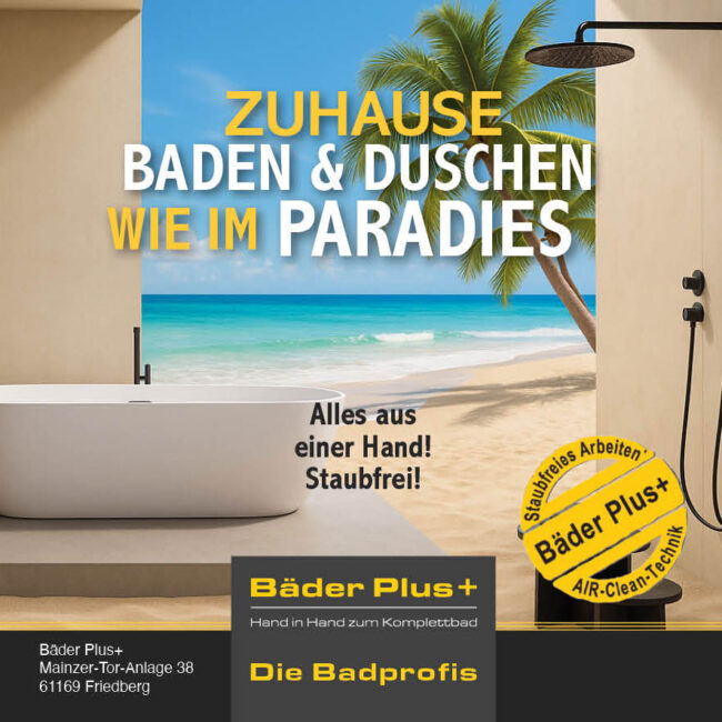 ZUHAUSE BADEN & DUSCHEN WIE IM PARADIES Ihr neues Traumbad Ihr Experte für Badsanierung & Badrenovierung Badstudio für persönliche Beratungen geöffnet! Alles aus einer Hand! Staubfrei! Zuverlässiger Meisterbetrieb für Komplettbäder und Heizungsbau in Rosbach vor der Höhe und Umgebung. Ihr Experte für maßgeschneiderte Lösungen in der Heizungstechnik.